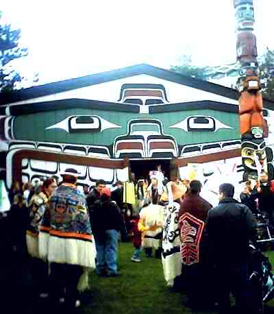 The Kwakiutl and their supporters gathered in Victoria, BC on February 12 , 2007 to protest a government-approved land transfer. The deal between Western Forest Products and the province would take private land out of three Tree Farm Licenses on northern Vancouver Island, including over 1400 hectares claimed by the Kwakiutl. Almost a hundred people, most of them native, filed into the traditional longhouse outside the BC Museum.